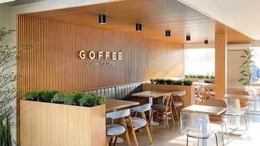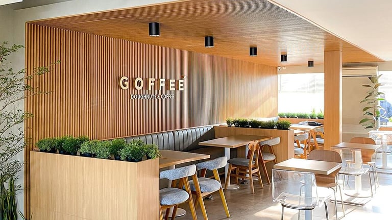 Desain interior Goffee Cafe dirancang dengan konsep modern–minimalis yang mengutamakan kenyamanan, kehangatan, dan estetika bersih. Sentuhan material kayu dengan pola garis vertikal pada dinding menjadi elemen utama yang menciptakan kesan elegan sekaligus natural. Perpaduan warna kayu terang, abu-abu lembut, dan pencahayaan alami membuat ruang terasa lapang, hangat, serta inviting bagi pengunjung.
