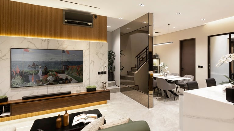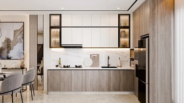 Foyer dan living room dengan konsep open space agar tidak terlihat sempit, Design disesuaikan agar memenuhi kebutuhan storage yang cukup banyak namun tetap nyaman dan estetik. Untuk area kitchen dan dining area terdapat appliances yang cukup banyak namun area yang terbatas, sehingga di design compact dan fungsional pada setiap sisinya.
