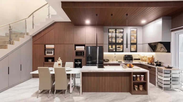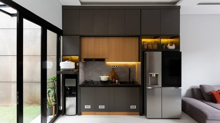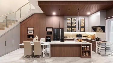 Desain kitchen set ini berfokus pada kebutuhan dapur yang kompleks. Klien menginginkan desain yang optimal dalam mengatur dan menyimpan perlengkapan dapur, sekaligus mendukung rutinitas memasak serta hobi membuat kue. Dapur ini mengusung konsep modern kontemporer yang selaras dengan desain rumah yang sudah ada.