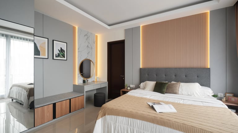 Desain Kamar tidur Modern dengan pemilihan warna yang terang memberikan nuansa yang elegan dan homey